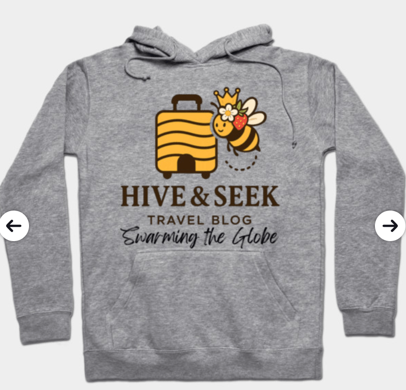 Hoodie (to pull up over your hair on the plane, train, and bus): https://hiveandseektravelblog.dashery.com/products/84015828-queen-bee-swarming-the-globe-hoodie