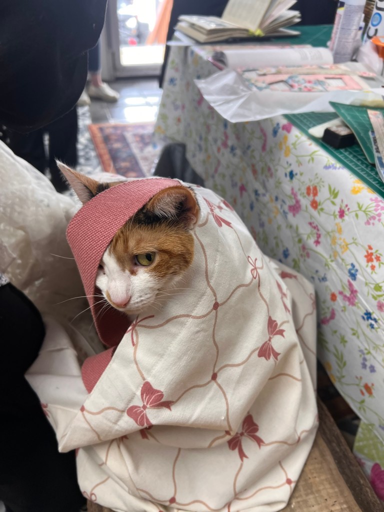 My latest class was taught by Linda Liabenow, aka The Paper Maiden. Our group spent four hours together at Main Street Floral, in downtown Cadillac, which is a great space for a small art class. Jack and Willow, the resident cats, provided entertainment when we needed a break. There was a great playlist playing softly, and the ambiance of the store was perfect to get our creative juices flowing.